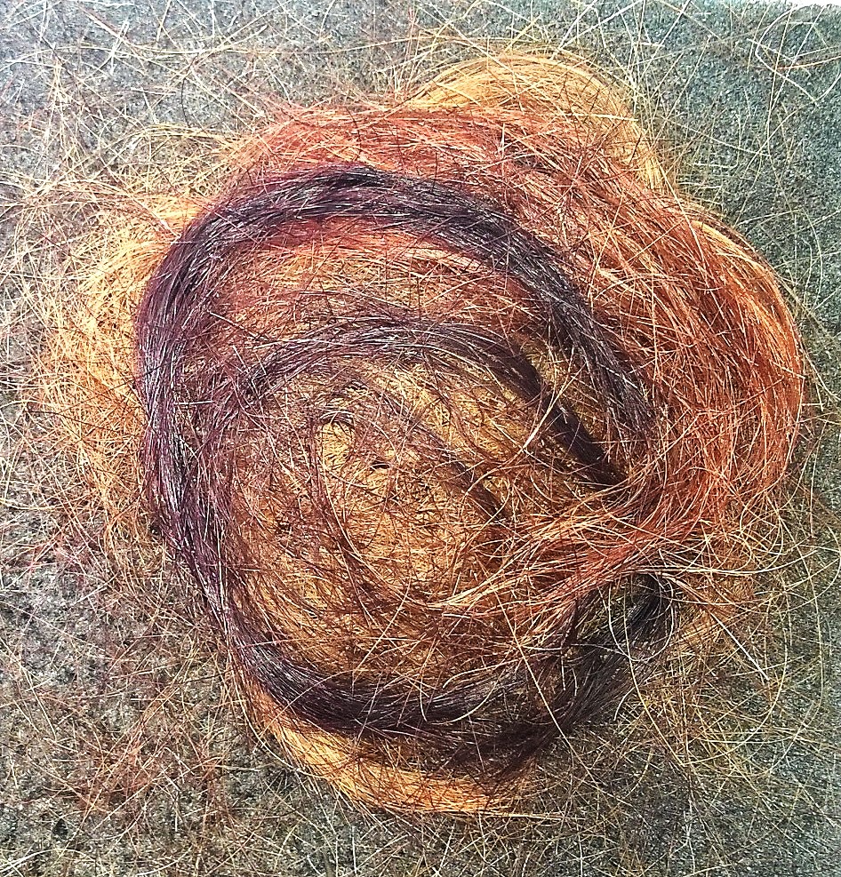 Development of my work with human hair, I first starting thinking about working with human hair at the beginning of the year, I have always touched my hair a lot as one of my coping strategies, I began to become aware that as I combed my fingers through my hair the occasional strand would fall loose and fall onto the floor. As I saw my hair fall, It seemed to me that I was leaving a mark the place, with my DNA. I then started collecting clumps of hair from the plug hole in the bathroom, until I had enough to start dreading it together. I thought it was interesting that I was shedding pieces of myself that would otherwise be lost, as I began to collect them it felt as if I was being reunited with myself. After working on felting the hair together, I started collecting hair from family members and adding that into the mix. As the hair was tied together, it started to produce metaphors of unity and kin, I began to see the work as DNA poetry. As the work developed, I started looking into creating different forms, from the hair, and soon decided to collect hair from a hairdressing salon, to expand the work. By using hair from a salon I was felting together the hair of strangers, which started to take the work in a different direction. Metaphors of community ties started permeated the work, as the hair grow into a pelt, it began to take on a primitive nature. The sound of the needle pulling in an out of the hair acts as a form of sculpture, appearing quite abstract when listening to it without watching the needle.